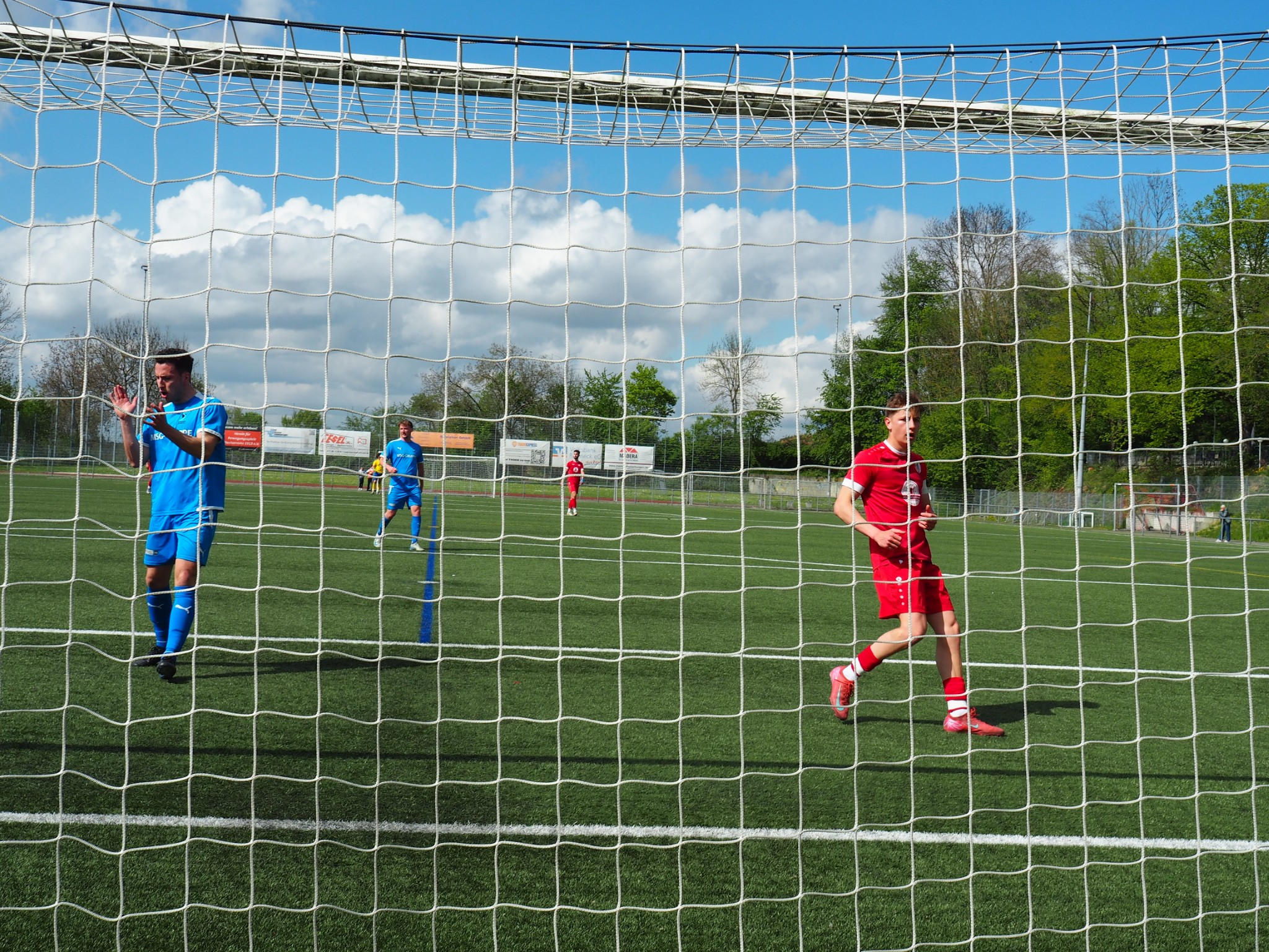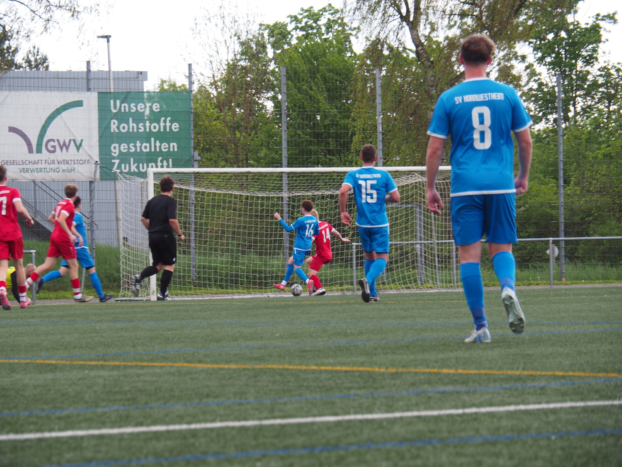 Nach einer halben Stunde die Führung aus dem Nichts. Paul Stumms Flanke flog von rechts über den ganzen Strafraum, wurde vom Asim zu Flo Noller gepasst, der die Kugel aus 18 Metern in den rechten Winkel schoss.